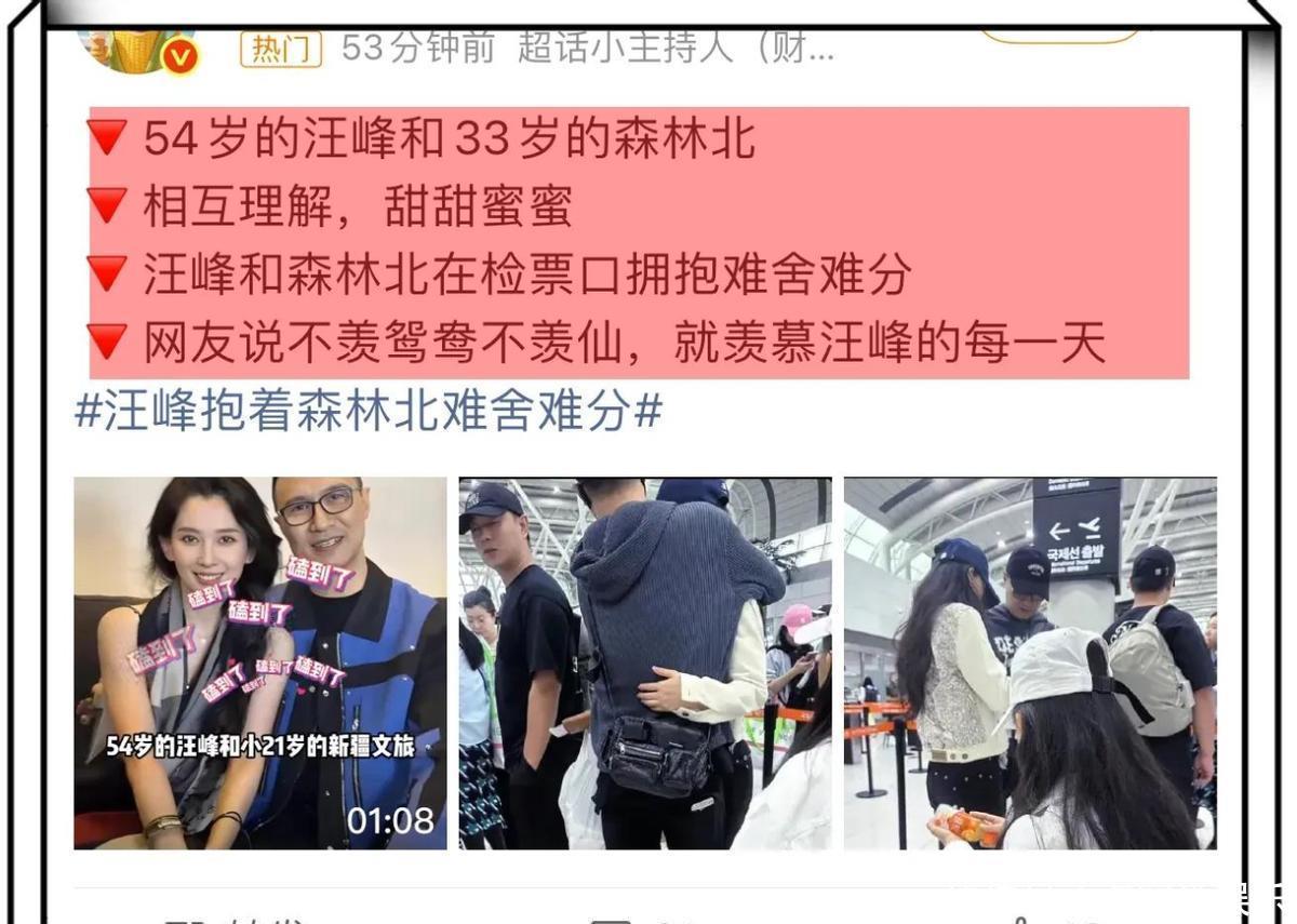 10月15日,网络上流传出一段视频,视频中是54岁的汪峰与33岁女友森林北,两人在候机队列中紧紧相拥的画面引发热议,相关场景迅速登上热搜。当天两人打扮低调,汪峰以休闲穿搭亮相,褪去了舞台上的摇滚锋芒,森林北则着装简约,可彼此间的亲密举动在人群中格外显眼。